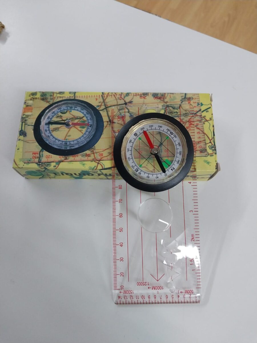 Brújula de placa base acrílica con rodamiento de azimut (limbo) y correa. Ideal para navegación cartográfica. Lectura con brújula de campo situada con lupa, regla de brújula y escalas 1:25000 y 1:50000.
